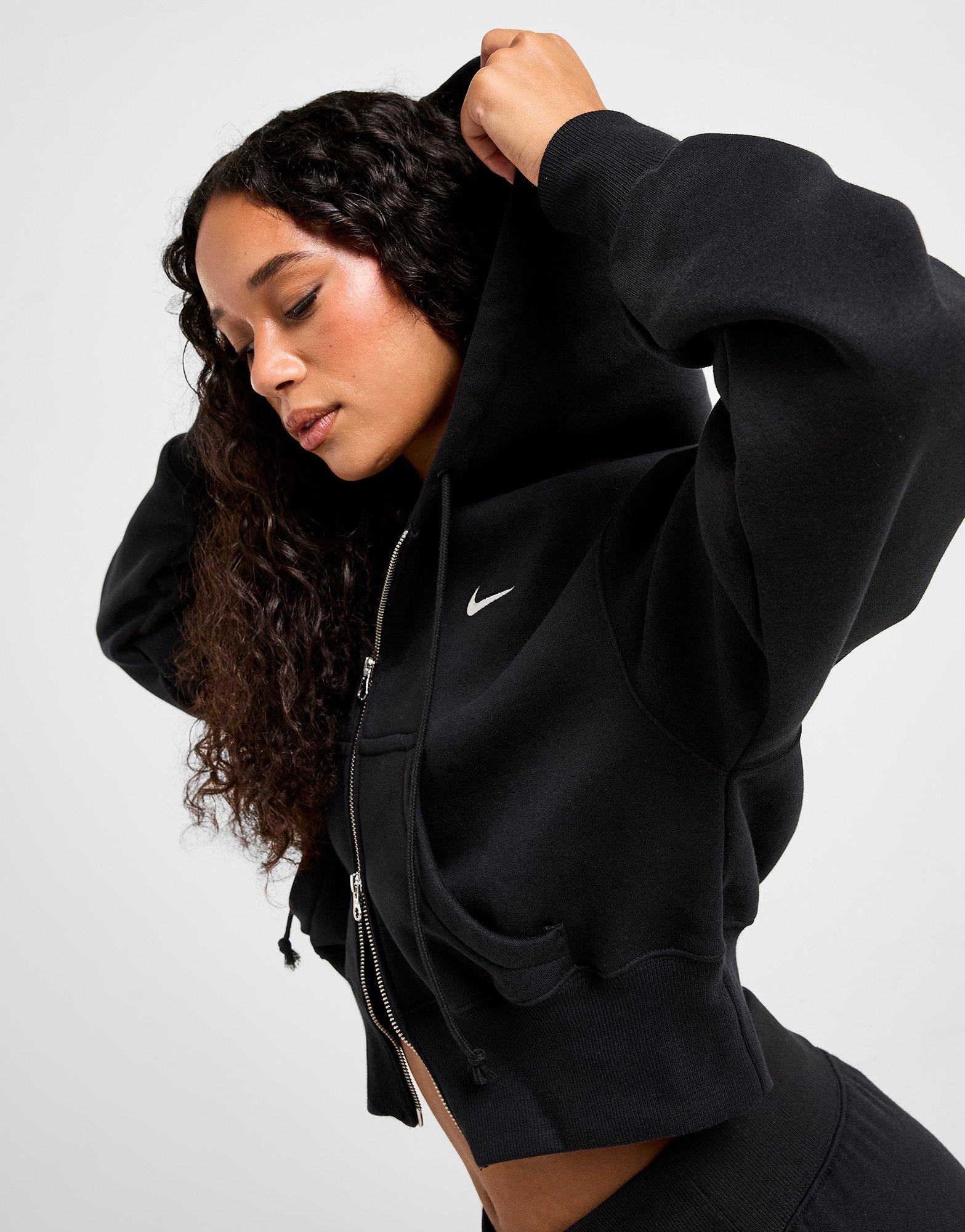 Време за чил. Затова избери дамския суичър с качулка Phoenix Crop Full Zip Hoodie от Nike. Черният цвят ще подхожда на всичко. Моделът е изработен от мекият флийс Phoenix на Nike. Пълният комфорт е гарантиран. Детайли като закопчаването с двоен цип и издължениет еластични маншети създават първокласна визия. Дизайнът се допълва от избродирано лого Nike Swoosh на гърдите. Може да се пере в пералня. | Моделът на снимката е с височина 170 см и носи продукт с размер S.
