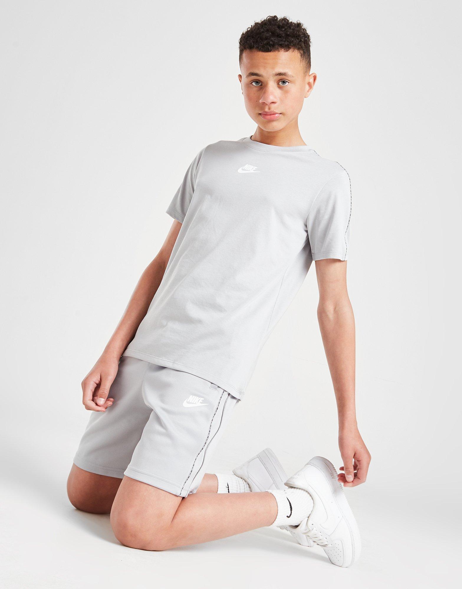 Осигури си ретро визия с младежката тениска Tape T-Shirt от Nike. Сивият тишърт с права кройка е изработен от мека материя от памук и полиестер за здравина и комфорт. Има класическо кръгло деколте и къси ръкави с контрастиращи детайли. Допълват се от лого Nike на гърдите. Може да се пере в пералня.