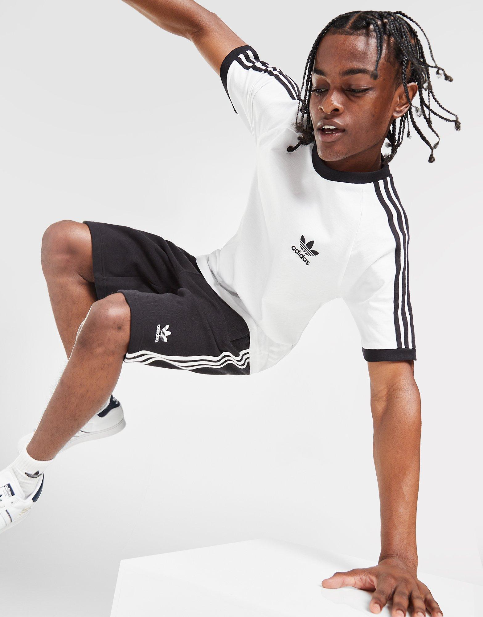Създай топ визия с мъжката тениска 3-Stripes California T-Shirt от adidas Originals. Моделът със стандартна кройка е изработен от дишаща памучна материя за ежедневен комфорт. Белият тишърт има еластично деколте и къси ръкави му придават класическа визия. Дизайнът се допълва от култовите 3-Stripes на ръкавите и лого Trefoil на гърдите. Може да се пере в пералня. | Моделът на снимката е с височина 183 см, гръдна обиколка 94 см и носи продукт с размер M. | IA4846